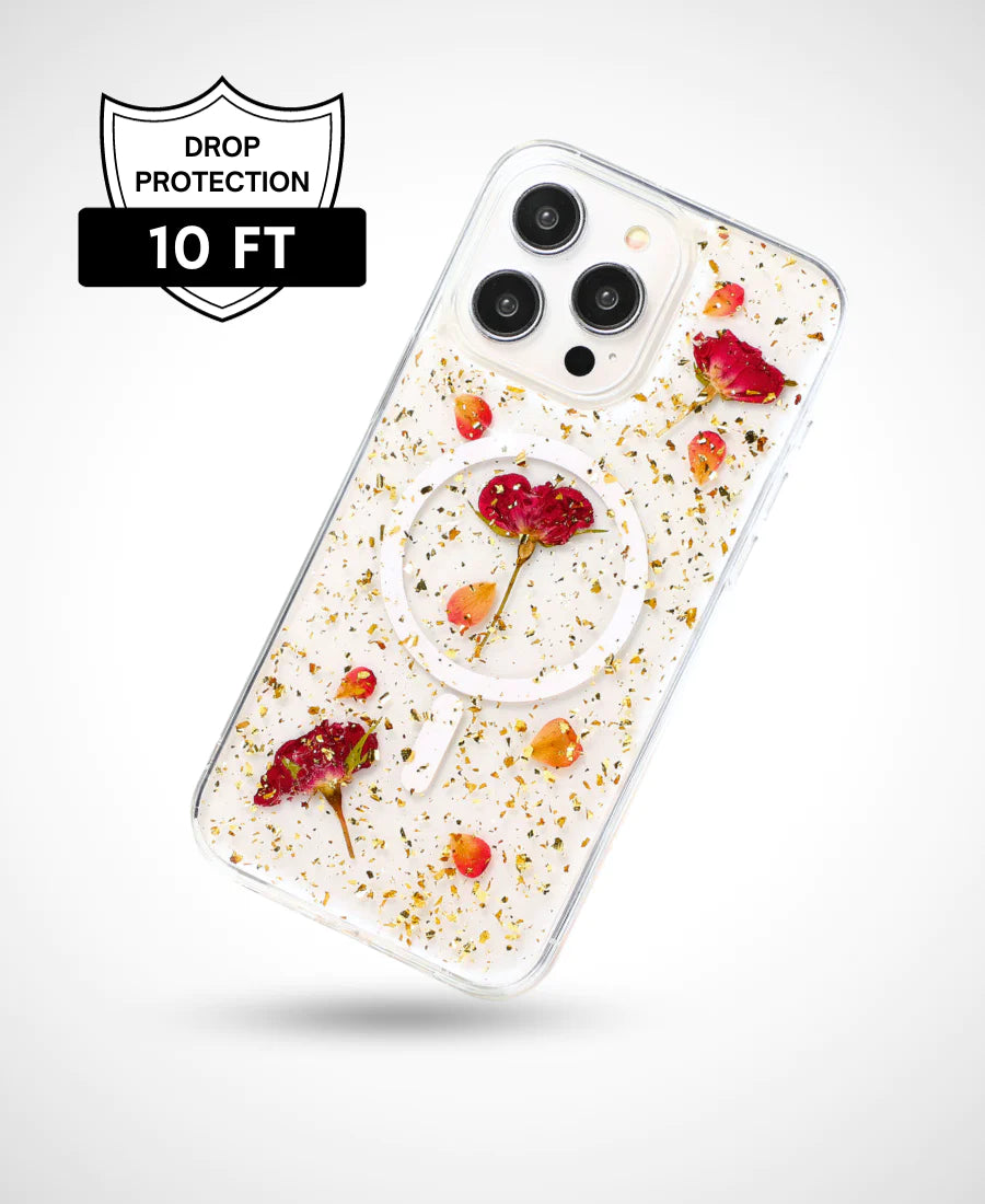 Introducing the protective Pressed Floral MagSafe phone case made with 100% real delicate flowers and gold flakes. Style without sacrificing protection!
