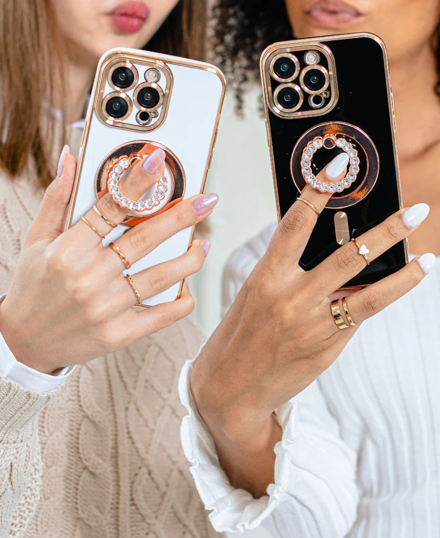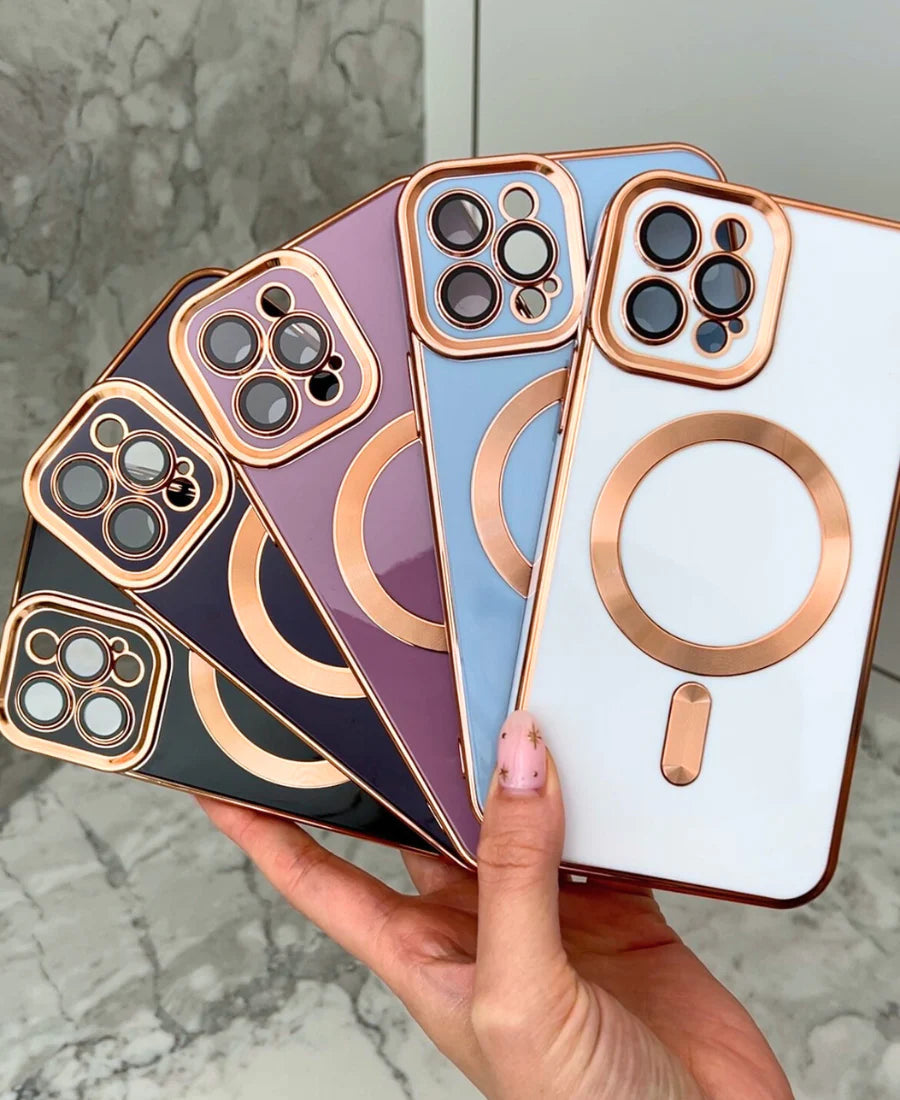 Introducing the protective Luxe MagSafe phone case complete with rose gold detailing and a glossy finish. Built-in lens protector keeps your camera lens safe from bumps and scratches.